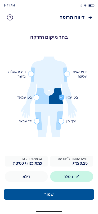 מיקום ההזרקה: לחצו על תרשים הגוף כדי לבחור את מיקום ההזרקה. סימן וי יאשר את הבחירה.